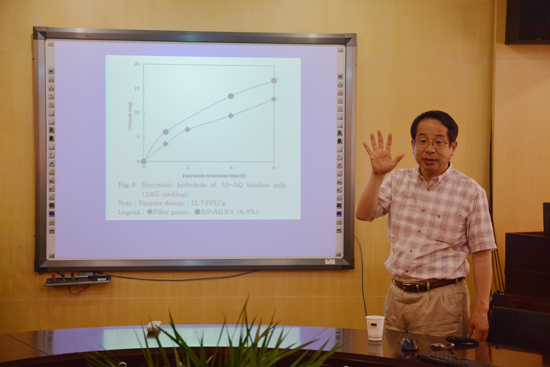 2015年5月10日,日本筑波大学生命环境科学研究科国际地缘开发科学专业主任大井洋教授来访新葡的京集团88142011协同创新中心和省重点实验室,并在三实讲坛作题为“Enzymatic Hydrolysis of Bamboo and Larch Alkaline Sulfite Pulps for Glucose Production(毛竹和落叶松碱性亚硫酸盐浆通过酶降解制取葡萄糖)”的学术报告,校党委委员、2011协同创新中心主任、省重点实验室主任毛建卫教授以及2011协同创新中心和省重点实验室相关教授博士和研究生参加了报告会,学院副院长王立军主持了报告会。