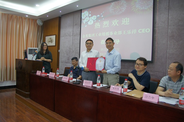 金光集团工业用纸事业部CEO王乐祥、宁波中华纸业有限公司和宁波亚洲浆纸业有限公司人力资源处处长龚永伟、生化/轻工学院院长刘士旺教授、浙江省造纸学会理事长胡开堂教授、教务处副处长沙力争教授、生化/轻工学院副院长杨瑞芹教授、轻化工程系部分骨干教师及学生出席并见证签约仪式。